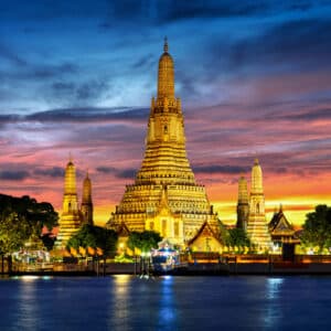 Quand le jour décline, la ville se pare d’or. Depuis un rooftop confidentiel, admirez la lumière dorée embrasser le temple du Wat Arun et le fleuve Chao Phraya, un moment suspendu, empreint de beauté et de sérénité.