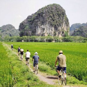 Depuis Hanoï, prenez la route vers Hoa Lu, une vallée paisible entourée de montagnes calcaires et de rizières éclatantes. Ancienne capitale du Vietnam au Xe siècle, elle dévoile encore les vestiges des dynasties Dinh et Le à travers temples et pagodes millénaires. La matinée se poursuit par une balade en sampan traditionnel au fil des canaux, entre grottes secrètes et paysages d’une beauté saisissante. Après le déjeuner, enfourchez votre vélo pour une découverte douce de la campagne : petits chemins bordés de bambous, rencontres villageoises et visite de la pagode Bich Dong, “la pagode de Jade”, nichée au cœur de la végétation. Une journée au rythme lent, entre nature, culture et authenticité.