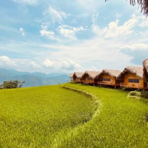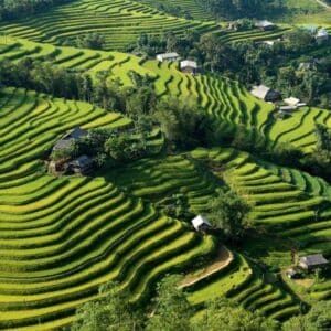 Départ matinal depuis Hanoï en direction du Nord du Vietnam. La route s’élève peu à peu au fil des vallées du Fleuve Rouge, dévoilant des paysages vallonnés et les premières rizières en terrasses. Dans l’après-midi, arrivée au petit village de Nam Hong, habité par l’ethnie Dao rouge. Installation dans un lodge montagnard en bambou et chaume, perché face aux rizières. Balade libre autour du village pour s’imprégner de l’atmosphère paisible et du panorama saisissant sur les montagnes sculptées. Dîner et nuit au Hoang Su Phi Lodge.