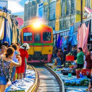 Depuis Mae Klong et son marché traversé par un train, jusqu’au célèbre marché flottant de Damnoen Saduak, la matinée dévoile des scènes de vie locales à la fois authentiques et insolites. Puis cap sur Kanchanaburi et la rivière Kwai, où l’histoire émouvante du tristement célèbre Death Railway, construit au prix de milliers de vies, se mêle à la beauté spectaculaire des paysages que l’on découvre à bord du train touristique serpentant à flanc de falaise.